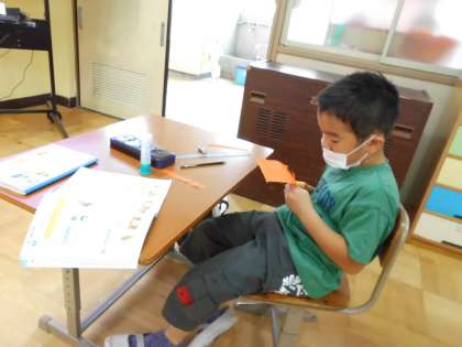 長さの学習の中で,色紙を2センチメートルの幅に測って切りました。それをつなげると…きれいなわ飾りの完成!「きれいやなあ」「持って帰りたい!」といった声が上がっていました。