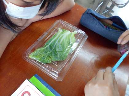 モンシロチョウの幼虫が育ってきて,キャベツの苗も穴だらけになってきました。そこで,班ごとに幼虫を育てることにして,何が必要か調べました。