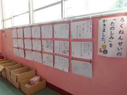 国語の学習では,自分の楽しみな時を短歌に書きました。その楽しみの短歌を1年生の教室の前に掲示しました。1年生に見せるということで,ウキウキしながら短歌を書きました。様々な楽しみなことがあり,読んでいると楽しくなります。