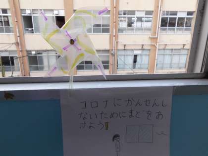 ライフ委員会が作った『風車』が風に揺られて,くるくると回っています。風車が回るように,窓を開けて換気に気を付けていきたいですね。また,日直が考える『今日のめあて』にもあったように,こまめに手洗いをする,ということにも気を付けていきたいですね。