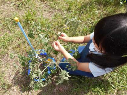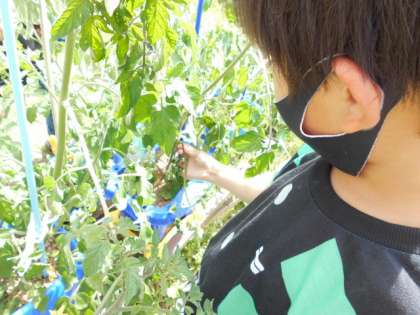 栄養を「トマト」に送るために,葉の数を増え過ぎないようにしなければいけません。「わき芽」をとって,おいしいトマトになるようにしました。