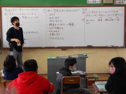 理科では,「体のつくりとはたらき」の単元に入りました。これから,空気を吸ったり吐いたりする時に,何を取り入れて,何を出しているのかを調べていきます。子どもたちは,今まで学習してきたことをもとに,酸素や二酸化炭素,窒素の3種類の気体ではないかと予想していました。