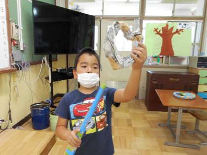 新聞紙を丸めたり,くしゃくしゃにしたりしていろいろなものを作りました。細く巻いて…テープでとめて…ハートのわっかを作って…何ができたのかな?