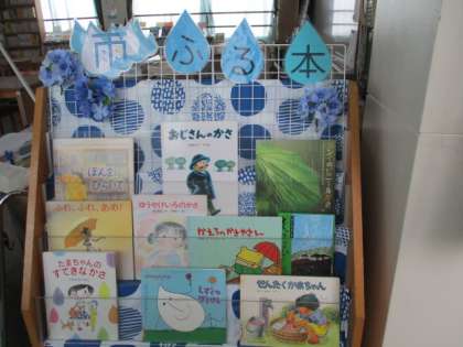 図書館のコーナーには,「雨ふる本」と題して,雨や水に関する本を並べています。ぜひ手に取ってみてほしいと思います。