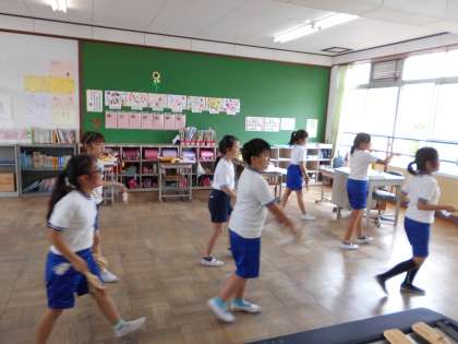 体育「民謡 鳴子」では,振り付けを覚えて踊ったり,グループで新しい振り付けを考えたりして踊っています。「みんなで踊ると気持ちがいい!」「鳴子の音が合わさると良い感じ!」などと言いながら楽しみながら踊っています。