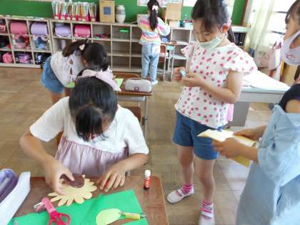 飾り係さんが,夏のかざりを作ってくれています。夏らしいスイカやひまわりのどの飾りが出来上がりました。梅雨の時期の飾りも考えてくれているようです。教室がぱっと華やかになりました。