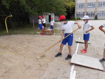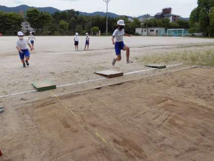 体育で「走りはばとび」の学習をしています。まずは,準備の仕方や学習の仕方を確かめたあと,今時点でどれくらいとぶことができるのか,計測しました。次からは,どうやったら遠くまでとぶことができるのか,ということを考えながらやっていきましょう。