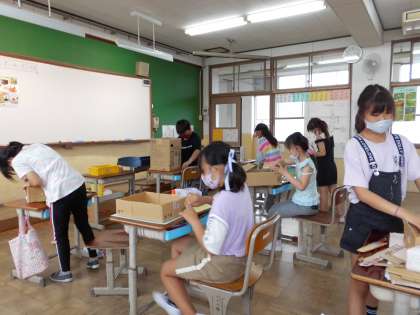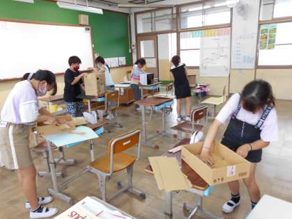 図工「おもしろダンボールボックス」は,ダンボール箱を切って形をかえながら,楽しく使える自分だけの入れ物を作りました。「私はネコボックスにしよう!」「べんりボックスにしよう。」と楽しみながら作りました。