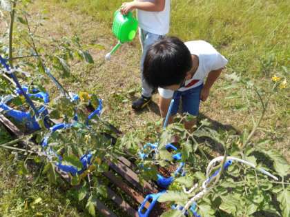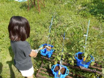 ミニトマトに水やりをしている様子です。金曜日に見た時より実が大きくなっていて,水やりをしながら友達と「見て!〇〇さんのミニトマトがこんなに大きいよ!」話しています。良い天気が続いているので,たっぷりと水をあげていました。
