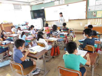 「海風きって」を歌ったり,けんばんハーモニカの運指の練習をしたりしました。歌を覚えたので,はっきり歌えています。鍵盤ハーモニカで演奏する部分は,階名で歌い,合わせて,指使いも練習しました。ドからソへ親指を動かすときにうまくできないこともありましたが,階名で歌いながら,指先に集中して練習していました。