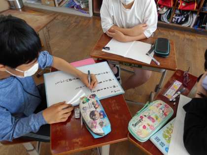 国語の学習では,話題を決めて話し合いの学習をしました。そのまとめとして,聞くときに大切なことについて話し合い,班ごとにホワイトボードにまとめました。