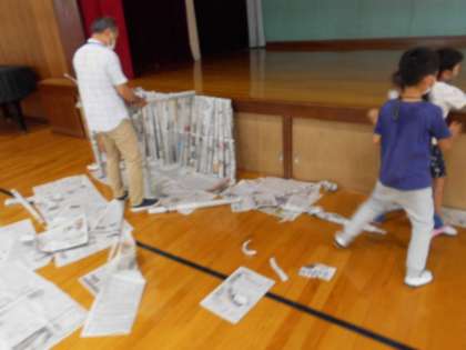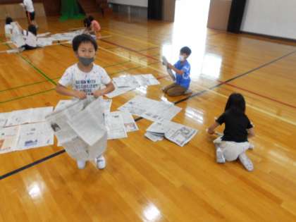 体育館で,新聞紙を触って,丸めたり,ねじったり,並べたり,思いついたことをいろいろと試しながら,頭の中でイメージしたものを作って楽しみました。