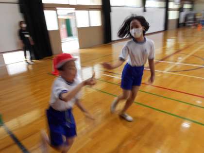 いろいろな姿勢から素早くスタートして走ることに取り組みました。最初は立ったまま,次は後ろ向き,その次は三角座りから。最後はスキップをしました。みんなとても楽しそうに体を動かしていました。