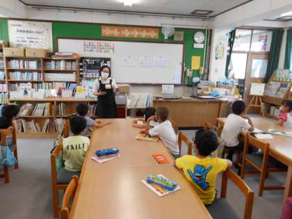 図書館で学校司書の先生にレオ=レオニさんの本のブックトークをしてもらいました。3つのおすすめポイントを聞き,読みたくなったようでした。