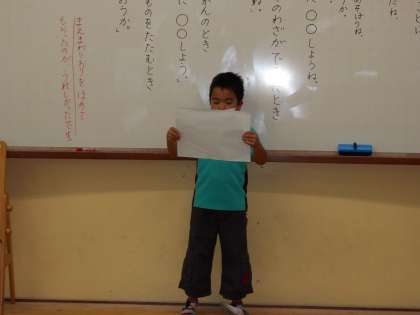 「言われてうれしかったことばってどんなことばがありますか?」とたずねたら「一緒にあそぼう,って言われてうれしかった」とか「手伝おうか,と言われてうれしかったよ」などなど,いろいろな意見が出ました。最後に一人一人どんなときにうれしかったか作文に書いて発表しあいました。