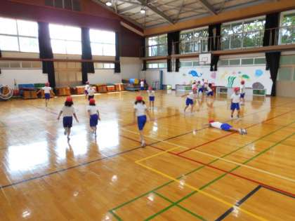 音楽に合わせて,5つの場面を表現しました。子どもたちは元気に動き回ったり,音楽やお話に合わせて体を動かしていました。