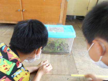 モンシロチョウの育ち方を調べて,ほかの昆虫についても観察してみることにしました。カブトムシは,昆虫マットを交換するために,中にいるものを出して見ました。元気よく動いているのを見て驚いていました。バッタの幼虫を飼育箱で育てるのに何がいるかを考えて,エノコログサを入れることにしました。