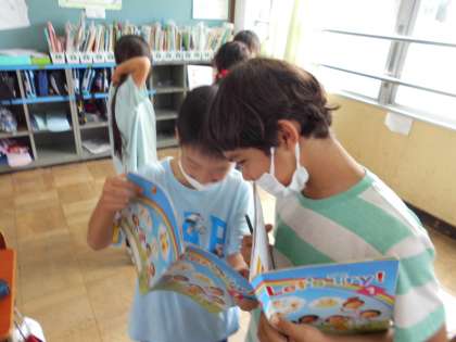 教科書のリンゴの絵に色を塗り,塗った数を尋ねたり,答えたりしながら,交流を楽しみました。