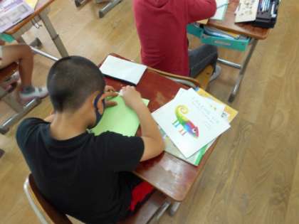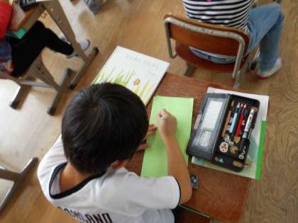 「スイミー」を学習して,レオ=レオニさんの別の作品を読みました。そして,おすすめの1冊を紹介するリーフレットを作り始めました。みんなに手に取ってもらえるように一生懸命作っています。