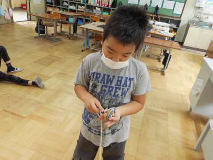 最近はやっているこままわしの遊び。最初は6年生だけで遊んでいましたが,その遊びがだんだん広がって最近ではチャレンジする子が増えてきました。少しずつ上達する3年生。一方で最初からできていた6年生は新しい技を次々とマスターしています。もう達人級の腕前です。
