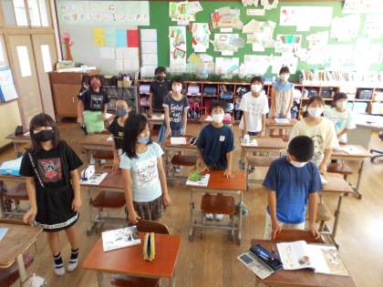 今日はHappy Thursday ということで,みんなでいろいろな場面で英語を使ってみようという日です。5年生では,学習の始まりと終わりのあいさつも英語で言うようにしています。今日の日直に当たった人は,「えーと,えーと道徳って何て言うんやったかな。さっき覚えてたんやけどなぁ。」と外国語の時間に学習したことを思い出しながら,あいさつを言ってみようとがんばっていました。6時間目には「総合的な学習の時間」があり,「これ,めっちゃ大変なやつ〜!」と周りの友達と共感しながら伝えようとしていました。さて,「総合的な学習の時間」はなんと言うかわかりますか?