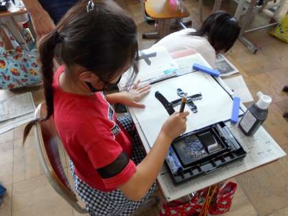 縦画に気をつけて,「土」という字を毛筆で書きました。始筆の向きや,ふでを寝かさないこと,終筆のまとめ方などに気をつけながら,それぞれ,力強い作品を仕上げていました。
