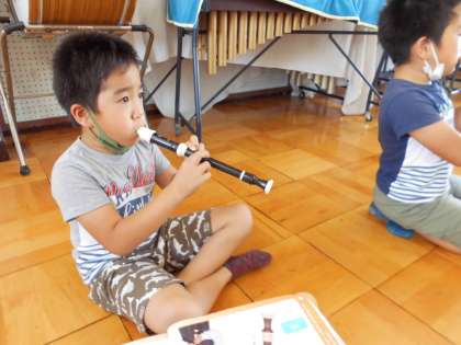 音楽で初めてリコーダーの演奏に取り組みました。まずは左手を上にして右手で支えて…。人差し指と親指で押さえて息を吹き込むと…『シ』の音が。トゥーとしっかり息を吹き込む練習をしました。これから交流学級だけでなく,くすのき学級でも取り組んでいこうと思います。