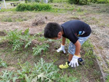 くすのき畑の野菜たちが大きくなってきました。でも,同時に雑草たちも大きくなってきています。毎日「草引き30本ずつ」を合言葉にがんばっている子どもたちです。