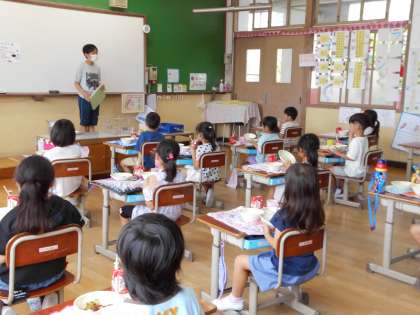 お昼には,GM委員会のお兄さんが来てくれ,今月の生活目標など代表委員会で決まったことを知らせてくれました。