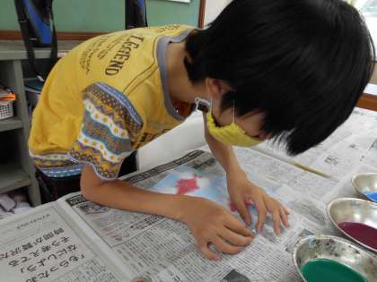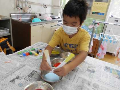 きれいな色水で紙を染めました。紙の折り方で染まり方も違います。たくさんの色を並べて自由に染めてみました。一人一人ちがう色合いですてきでした。