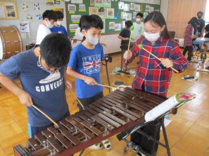 音楽では「ラバース コンチェルト」という曲を練習しています。まずは主旋律を木琴や鉄琴で演奏してみました。何度か繰り返すうちにうまく演奏できるようになってきました。