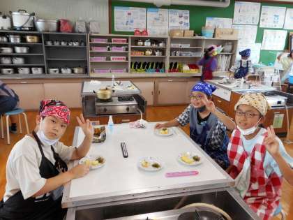 みんなで協力し,完成させることができました。「じゃがいもがちょっと硬かったなぁ。」「ほうれん草が水っぽいのはなんでやろう?」などと言いながら味わっていました。