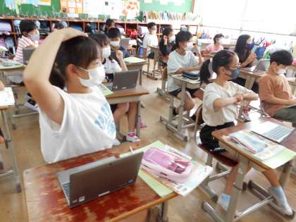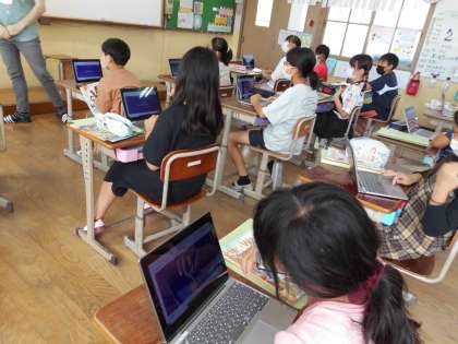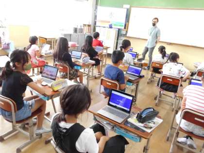ALTの先生と一緒に学習をしました。教科や時間割の言い方について学習をしているので,それに関係するクイズをパソコンで作ってもらったものをみんなで楽しみました。