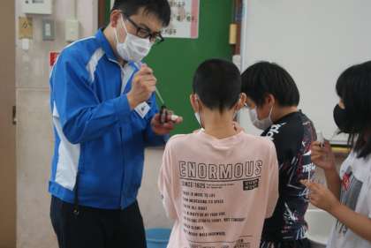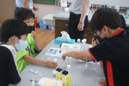 最後にハンドソープを作りました。入れる活性剤の量で粘度が変わりました。子どもたちは好きな粘度を選び,お気に入りのにおいを付けました。青リンゴのにおいが人気でした。家でもぜひ使ってみてください。