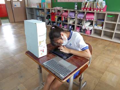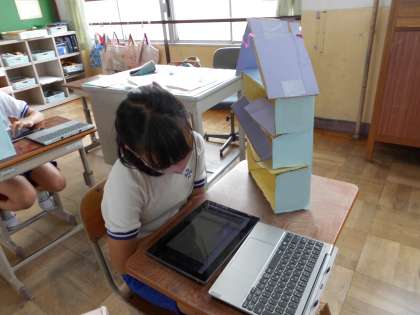 「おもしろダンボールボックス」で作った作品の工夫した所,見て欲しい所をタブレットを使って表現しました。初めて取り組む活動でしたが,写真を撮ったり,提出箱へ提出したりと友達と教え合いながら自分の思いをしっかりと表現することが出来ました。