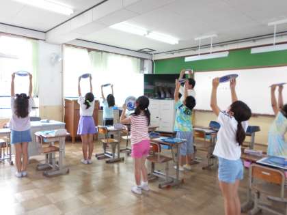 理科「月や星」の学習では,星座早見盤を使って夏の夜空で見られる星座について学習しています。教室の天井を夜空に見立てて夏の夜空で見られる星座やおよその位置を確認しました。