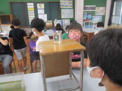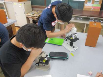 理科の「生物どうしの関わり」という単元で,池のメダカは何を食べているのかを調べました。まず,池の水をスポイトでとって垂らしたら,メダカは食べるのかを試してみました。すると,メダカは池の水を垂らしたあたりに泳いできて,パクパクと何かを食べている様子が観察できました。しかし,何を食べているのかわかりません。そこで次に池の水を顕微鏡で見てみました。すると,すごく小さな生物が動いているのを見つけました。子どもたちは驚いていました。