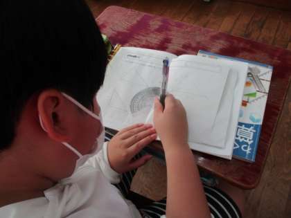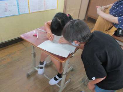 算数の三角形や四角形の作図の宿題の丸つけをしました。隣の人とノートを交換し,角度や辺の長さが合っているか分度器や定規で測りました。間違っていたら×をするだけでなく,「少しずれている」「角度や長さが書いていない」とノートにコメントを書いてわかるようにしていました。それを読んでしっかりなおしをしていました。