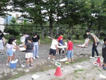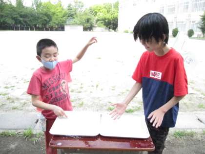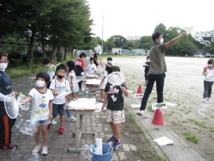 2年生と6年生を招待してしゃぼんだまやさんをしました。しゃぼんだまやさんも今日で2日目なので,子どもたちも慣れたもの。たっぷりしゃぼんだま液を作り,さっと準備をすると「いらっしゃい〜」「うちわをどうぞ」と案内していました。