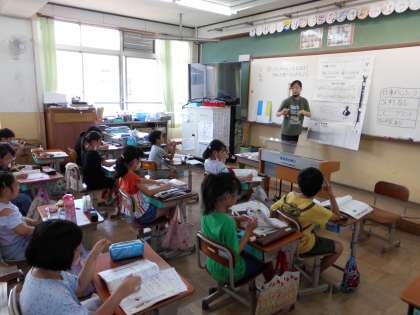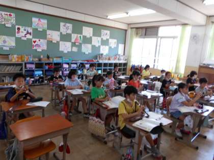 「きれいなソ,ラ,シ」の曲をリコーダーで練習しています。シ,ラ,ソの音の音を出すのにまだ,うまく穴をふさぎ切れていないため,音が割れてしまうこともありますが,がんばって練習しています。その後,『笛星人』の曲を練習しました。夏休みにも練習を続けていってほしいと思います。