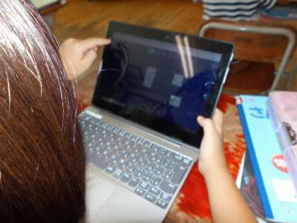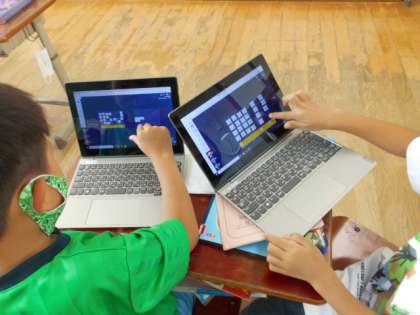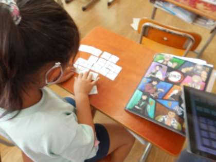 GIGA端末を使って作る,紙のカードで作るということを,自分で選んで学習を進めていました。また,友達と協力しながら課題に取り組む人もいました。