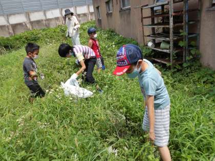 夏休みの間にくすのきばたけが雑草でいっぱいになっていました。「1学期に植えたすいかや,にんじんはどこにいったのかな?」といいながら草を抜くと,みんなの頭くらいのすいかが現れました。がんばって草抜きをしたので,畑がとてもきれいになりました。
