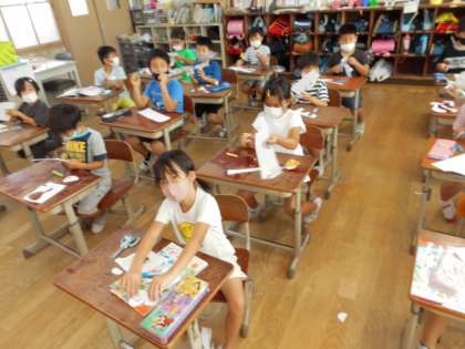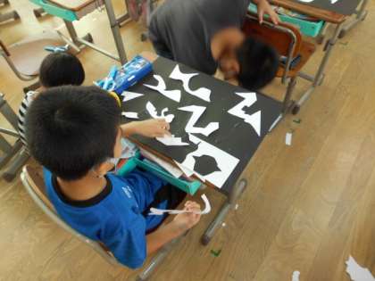 図工科の学習の様子です。まず初めに,いろいろな形に紙を切ることを楽しみました。そして,できている紙の形を何かに見立てたり,組み合わせたりして作品を作っていきました。