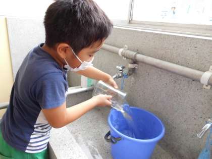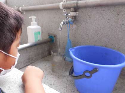 算数でかさの学習をしています。バケツにどれだけの水が入るか調べました。1Lますで水をはかって1ぱい,2はい…といれていくと…10ぱい入りました。「10Lも入ったね」とびっくりしていました。