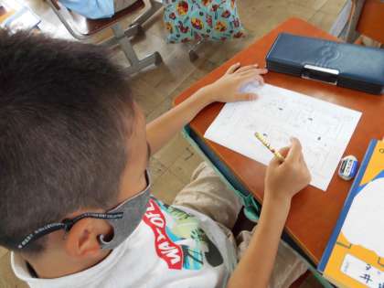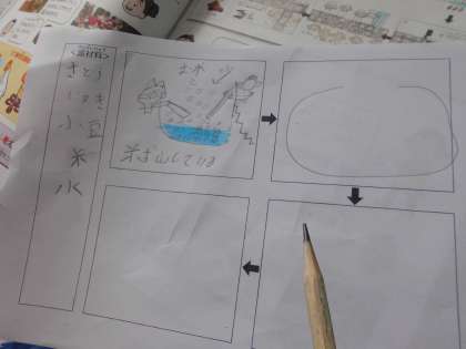 まず,生八つ橋がどのように作られているのかということをみんなでワークシートを活用して,予想をしました。イラストを描いたり,文章や言葉で表したりしながら,原材料から生八つ橋ができるまでを予想しています。