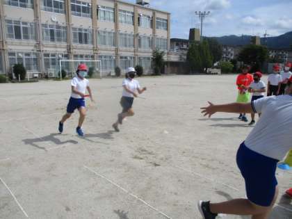 体育で「リレー」をしています。リレーはバトンパスが重要です。バトンパスが上手になってきたチームのタイムが速くなってきました。どんどんバトン練習をしてもっともっとチームのタイムを速くしていこう。