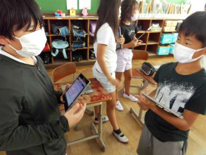 自分たちでオリジナル時間割を作って,紹介しました。「サッカー選手になりたいからspecial subjectは何にしようかな。」などと自分のオリジナルな教科を考えてグループでオリジナル時間割を作成しました。最後に友達にその時間割を紹介しました。自分たちが知っている英語を何とか使って友達に伝えようとしたり,聞いた感想を一生懸命に表現しようとしたりしていました。