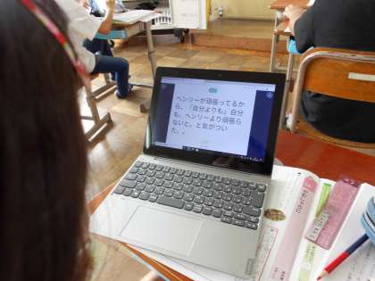 道徳の時間に考えた登場人物への気持ちを,ノートに書いたものを写真に写したり,文字で打ち込んだり,ペンで手書きしたりして交流し合いました。一人が全体に発表するのではなく,随時,人の考えたことを閲覧して,自分の考えと比べることができました。