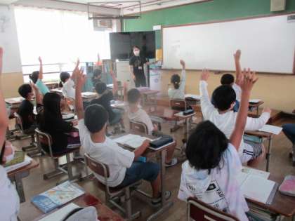 算数の「整数」で,約数について学習しました。授業のスタートで,先週休んでいた人のために,倍数や公倍数の復習をしました。「休んでいた人のために教えてあげて」と言うとたくさんの人が積極的にわかりやすく説明していました。最後には休んでいた人まで手を挙げて倍数や公倍数について説明できるようになっていました。