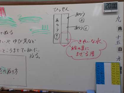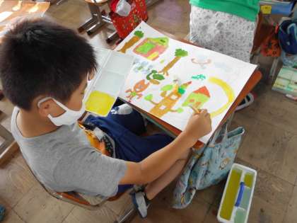 『野うさぎレストランへようこそ』を読んで,思い描いた風景を絵にしています。登場人物たちを細かく書上げ,一つ一つに色を決めて塗り上げていきます。混色が濁った色にならないように,筆洗いの水の使い方を指導しました。早速子どもたちは,筆を洗う部屋と絵の具を溶くための水を入れておく部屋を区別して,きれいな色で塗り始めています。出来上がりが楽しみです。